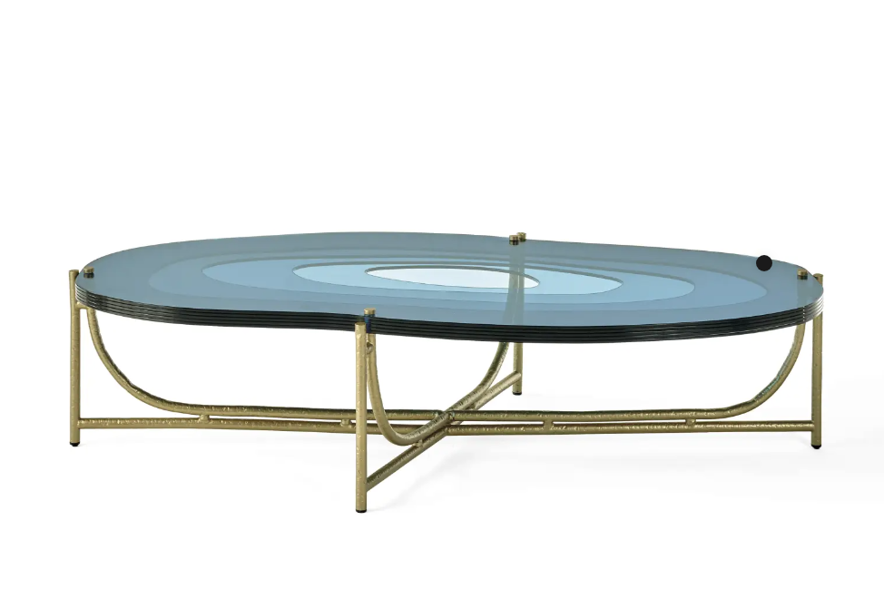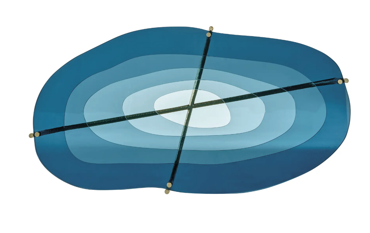 Konstrukcja stolika z kutych rur mosiężnych ze złotym wykończeniem. Blat wykonany z wielowarstwowego, kształtowanego i nakładającego się szkła w kolorze niebieskim lub brązowym.