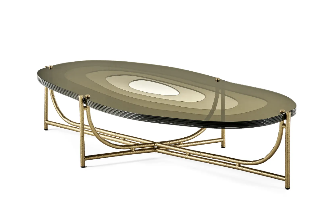 - Stolik Tahoe marki Roberto Cavalli Home Interiors łączy transparentne szkło z metalicznym wykończeniem. Blat z koncentrycznych warstw szkła tworzy efekt głębi i refleksów, a złota konstrukcja dodaje charakteru.