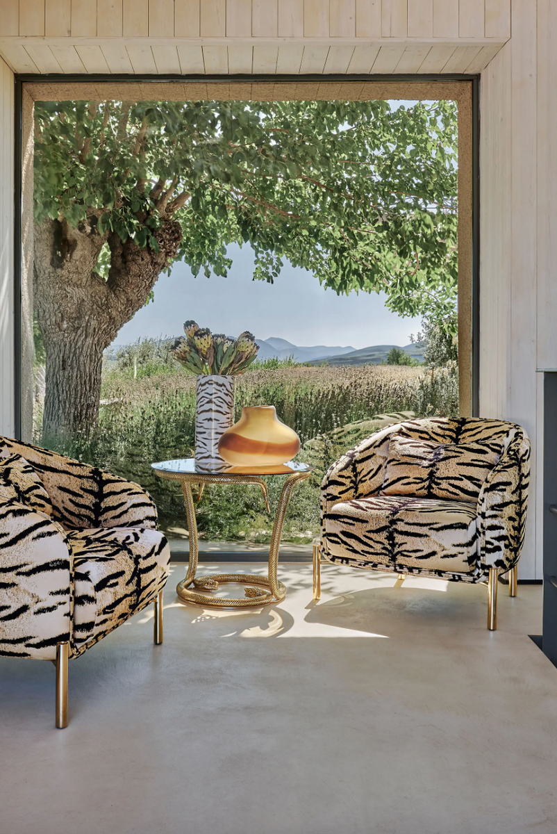 • Stolik Yoa marki Roberto Cavalli Home Interiors, wąż -Ikoniczny symbol marki Roberto Cavalli w stoliku Yoa przybiera formę rzeźbiarskiej podstawy z odlewanego mosiądzu. Fazowany szklany blat nadaje całości lekkości i wyrafinowanego charakteru.