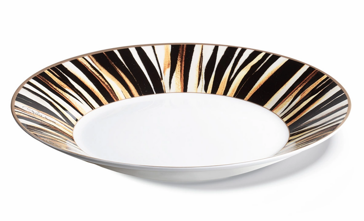 - Zestaw sześciu talerzy obiadowych Roberto Cavalli Home, z kolekcji Ray of Gold z wytrzymałej porcelany Bone China. Elegancki, zwierzęcy design z czarno-złotym rantem. Luksusowy styl na co dzień i na specjalne okazje.