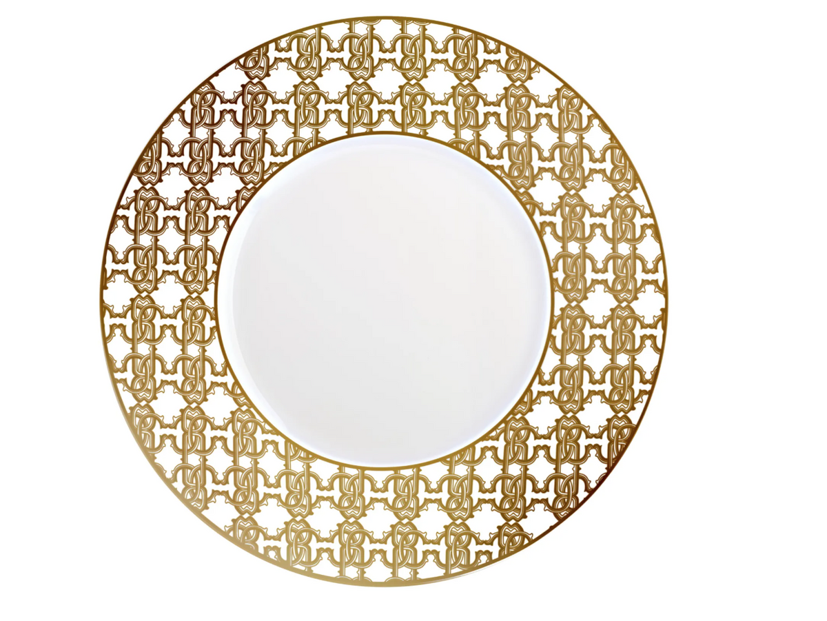 - Zestaw sześciu talerzy obiadowych Roberto Cavalli Home, z kolekcji Monogram Gold z wytrzymałej porcelany Bone China. To luksusowa kolekcja stołowa z barokową dekoracją w złocie. Elegancki i efektowny design zachwyci gości.