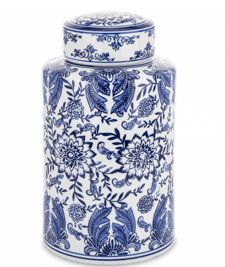 Waza ceramiczna Blue Ornament Classicto elegancki dodatek inspirowany klasyczną porcelaną w stylu chinoiserie. Biała ceramika bogato zdobiona granatowym, ornamentalnym motywem kwiatowym nadaje wnętrzu charakteru. Wymiary: 33 × 17,5 × 17,5 cm.