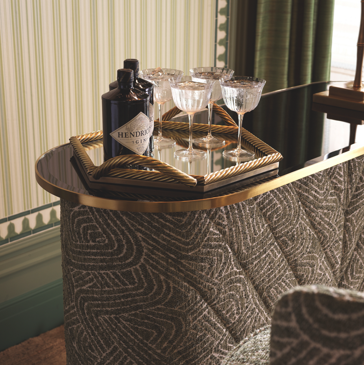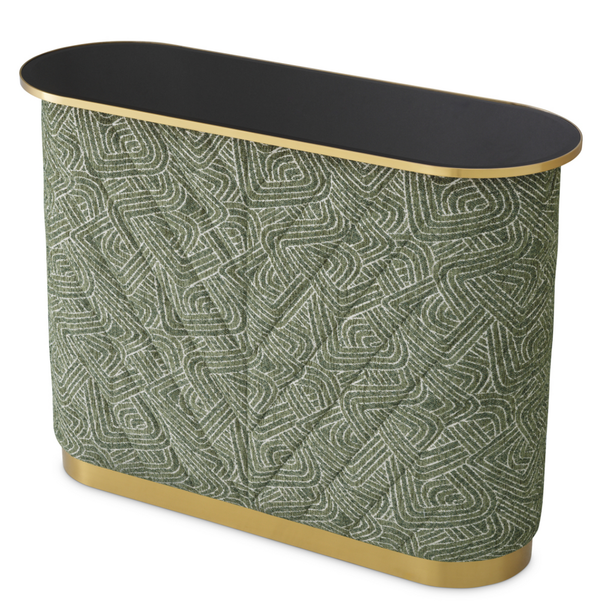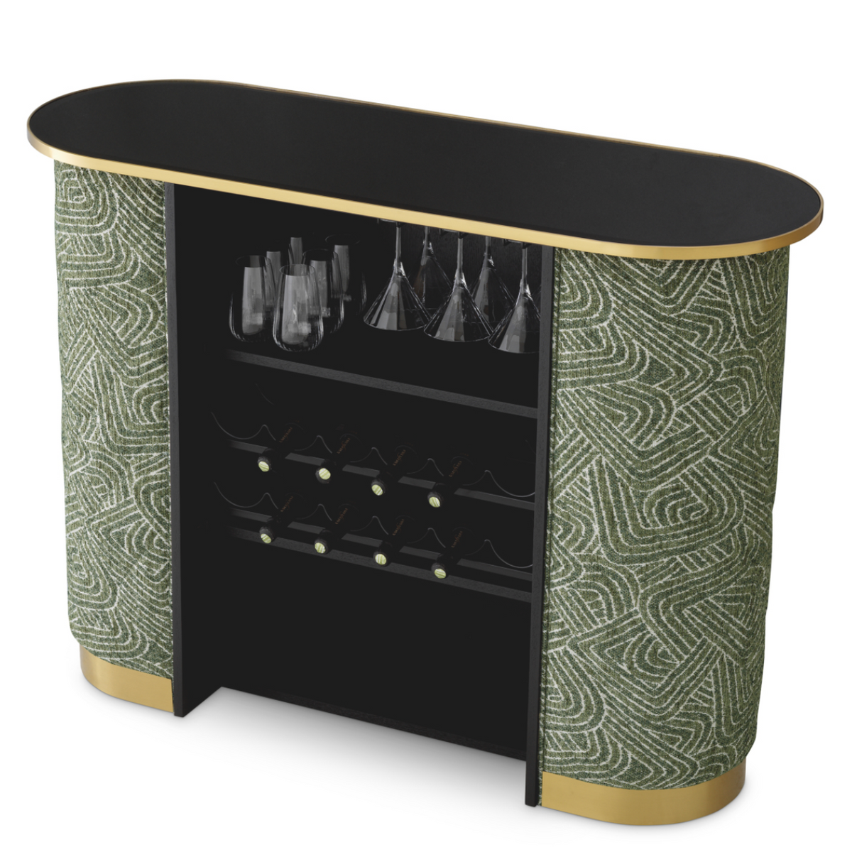 - Bar Matthew marki Eichholtz to luksusowy mebel, który zachwyca elegancją i funkcjonalnością. Tapicerowany tkaniną Camari Green, z wykończeniem z szczotkowanego mosiądzu i blatem z czarnego szkła.