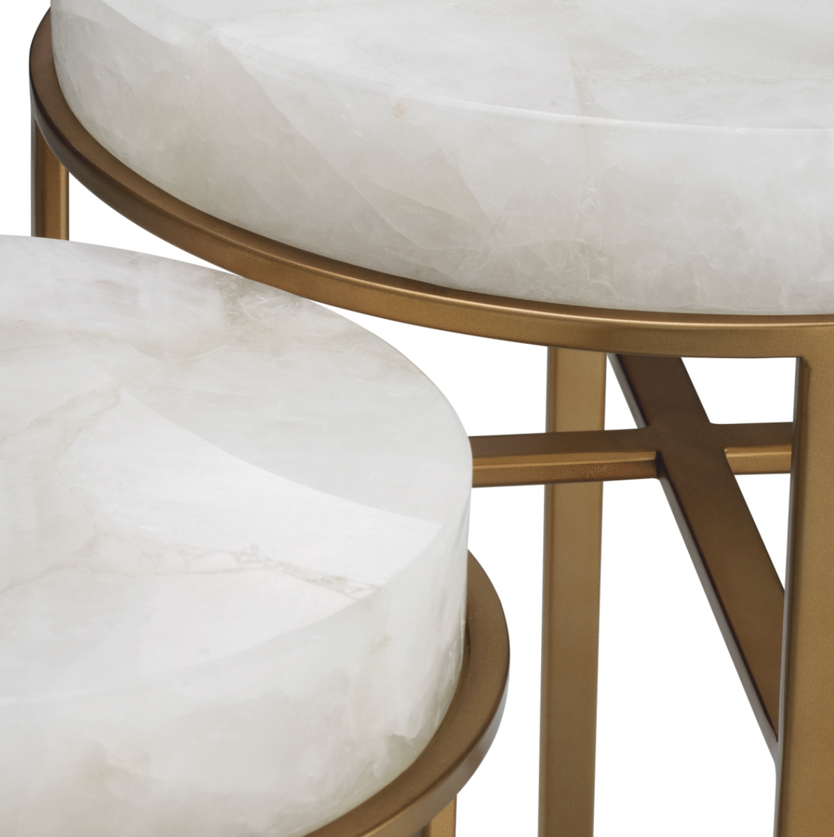 • Zestaw dwóch stolików Hoxton marki Eichholtz to esencja luksusu i elegancji. Konstrukcja w wykończeniu vintage brass połączona z blatami z kryształu górskiego tworzy efektowny, biżuteryjny akcent. Idealne do nowoczesnych, ekskluzywnych wnętrz.