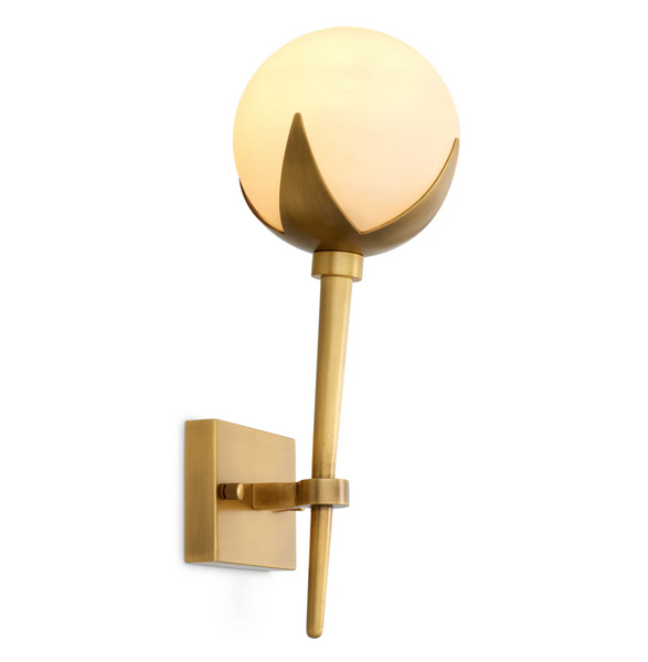 - Kinkiet Imperial marki Eichholtz ze szczotkowanego mosiądzu i szklanymi elementami z dymionego szkła, które rozpraszają światło, nadając wnętrzu ciepły i elegancki charakter.