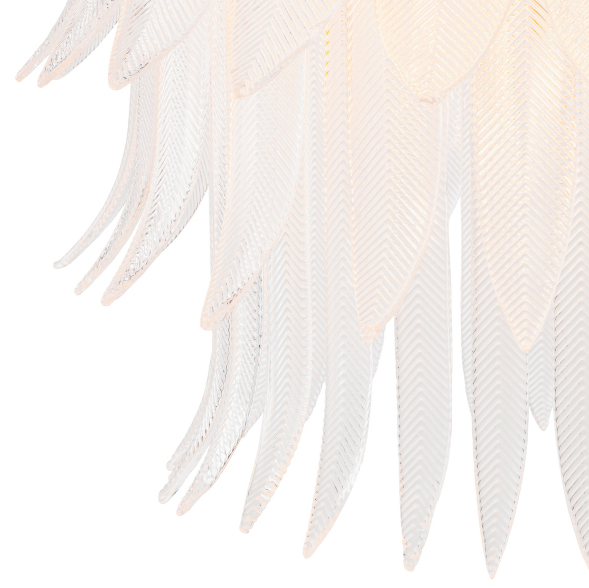 Ręcznie odlewane, szklane elementy w kształcie piór subtelnie mienią się delikatną iryzacją i układają w kaskadową, dynamiczną kompozycję, przywodzącą na myśl wachlarze i bogato zdobione nakrycia głowy z epoki flapperek. Delikatnie ryflowana faktura szkła przypomina haft lub metaliczną nić, zamieniając światło w miękki, luksusowy blask.