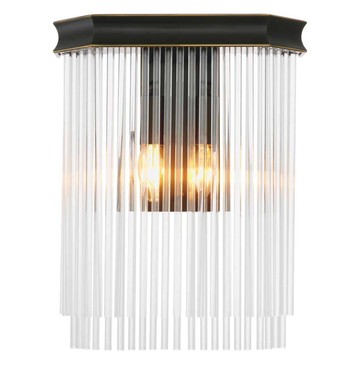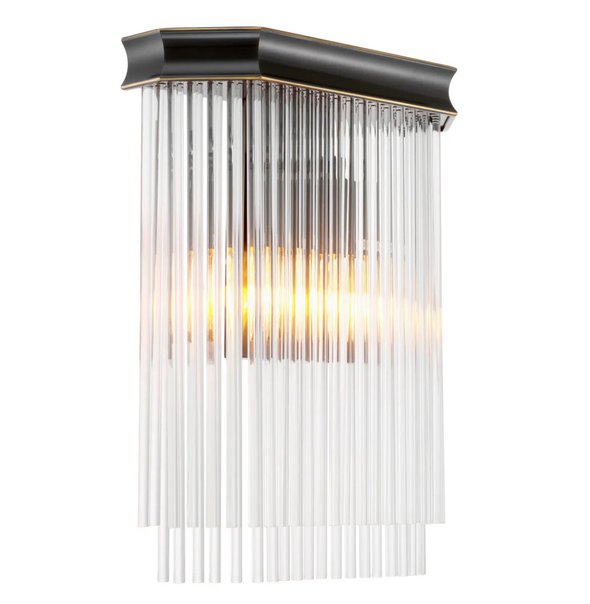 Kinkiet Estela marki Eichholtz to eleganckie połączenie stylu Art Deco i nowoczesnej formy. Szklane pręty efektownie rozpraszają światło, a geometryczna rama w wykończeniu bronze highlight nadaje wnętrzu luksusowy, dekoracyjny akcent. Wymiary: szer. 31,5 | głęb. 10,5 | wys. 37 cm
