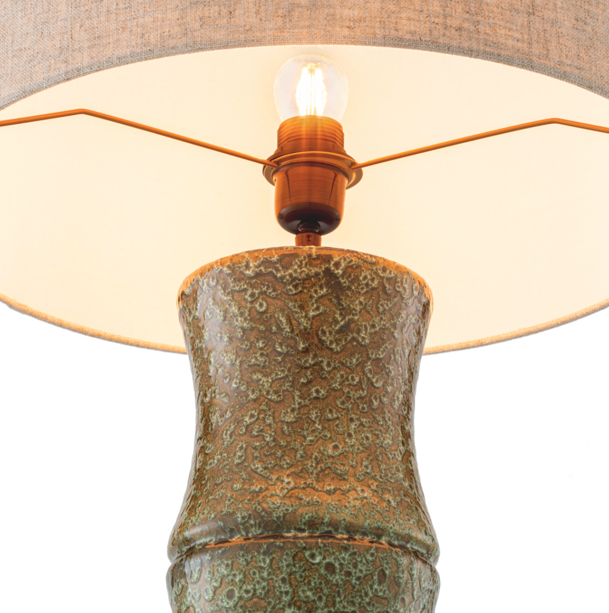 Lampa stołowa Bonny marki Eichholtz to ręcznie wykonana w Portugalii ceramiczna forma, która łączy rzemiosło z ponadczasowym designem. Zielone, vintage’owe wykończenie oraz harmonijna sylwetka remembersy nadają wnętrzu ciepła, naturalności i elegancji. Doskonale prezentuje się na konsoli, półce lub stoliku, wprowadzając do przestrzeni artystyczny akcent. Wymiary: szer. 15 | maks. szer. 45 | wys. 78,5 cm