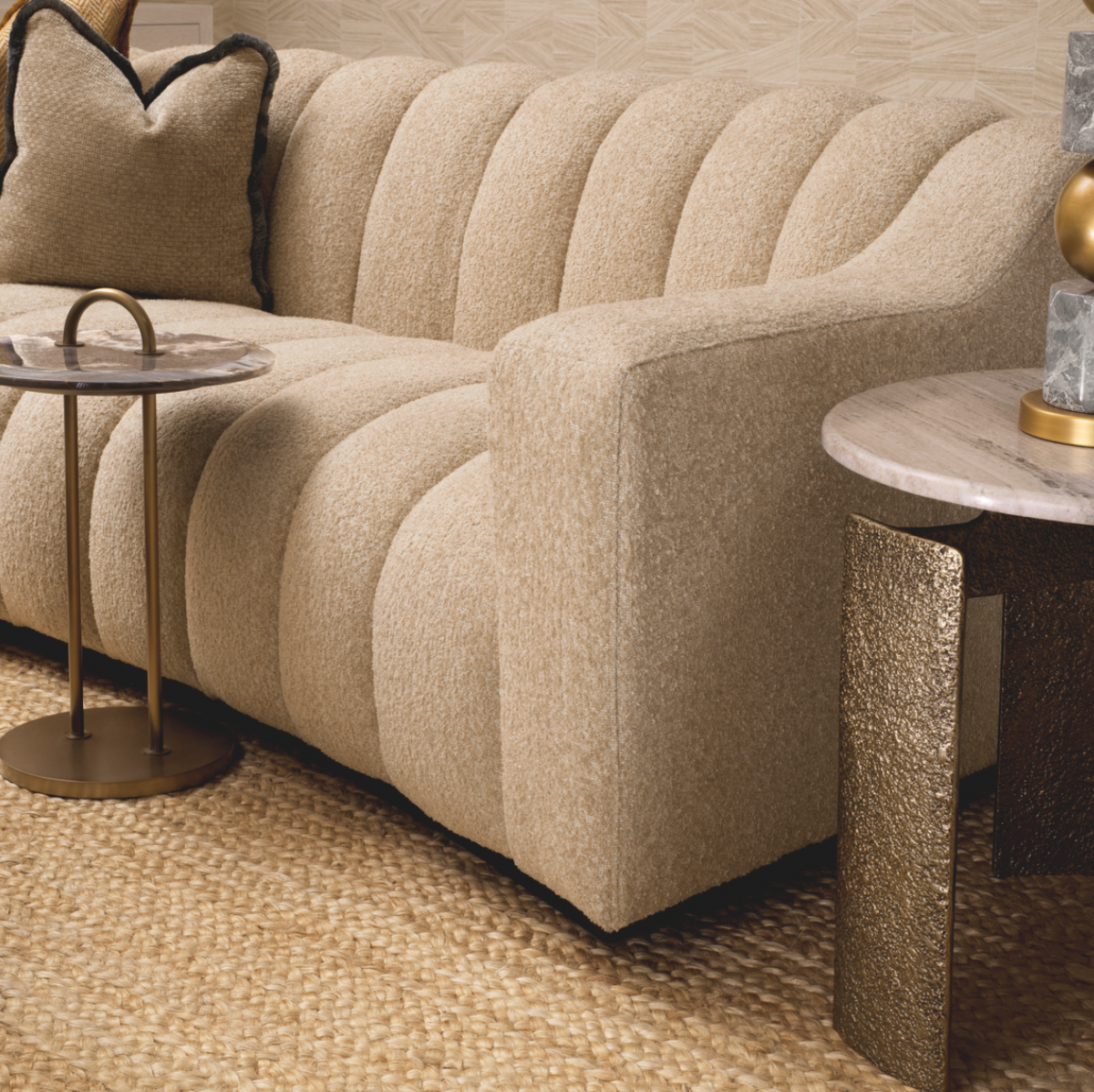 - Stolik boczny Bodega marki Eichholtz to eleganckie połączenie blatu z beżowego marmuru i podstawy w wykończeniu antique brass. Okrągła forma nadaje wnętrzu lekkości i ponadczasowej elegancji.