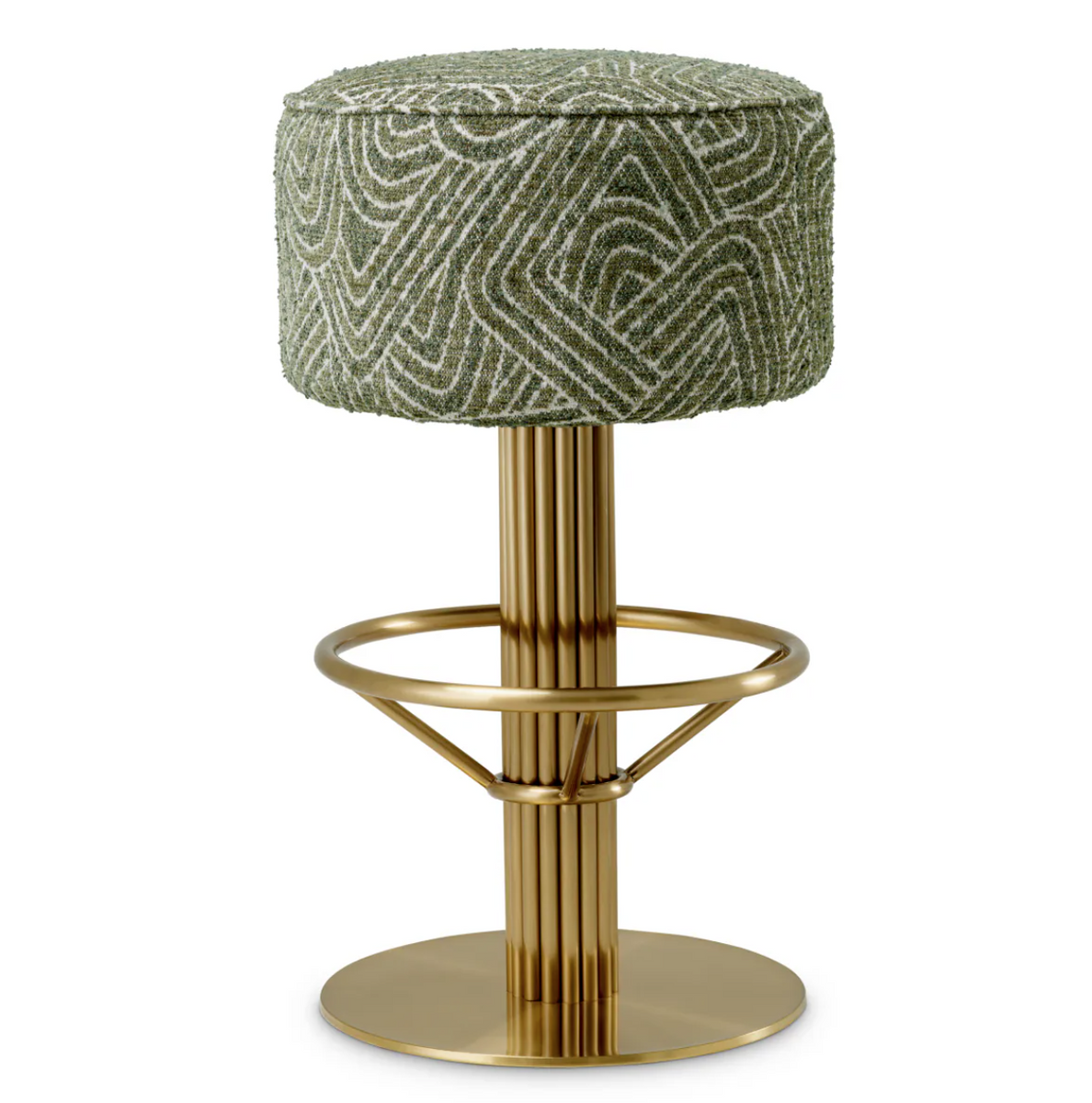 • Krzesło barowe obrotowe Carleton marki Eichholtz w tkaninie Camari green z podstawą ze szczotkowanego mosiądzu to połączenie elegancji i komfortu. Żakardowa tapicerka i obrotowa konstrukcja nadają mu luksusowy charakter.