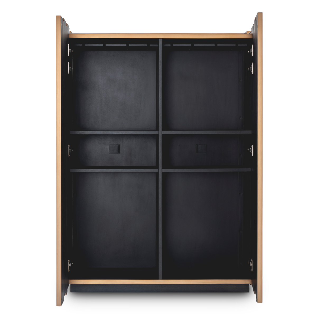 Bar Nottingham marki Eichholtz to wyrafinowana propozycja do wnętrz ceniących luksus i funkcjonalność. Połączenie szkła lustrzanego w wykończeniu antique mirror z akcentami ze szczotkowanego mosiądzu tworzy elegancki balans między klasyką a nowoczesnością. Mebel zaprojektowany jako uzupełnienie komody Nottingham oferuje cztery półki z sześcioma przestronnymi przegrodami, umożliwiając uporządkowane przechowywanie. Dwa otwory z tyłu pozwalają na dyskretne poprowadzenie kabli, dzięki czemu barek doskonale sprawdzi się jako stylowe centrum domowej strefy barowej lub ekspozycyjnej. Wymiary: szer. 110 | głęb. 46 | wys. 150 cm