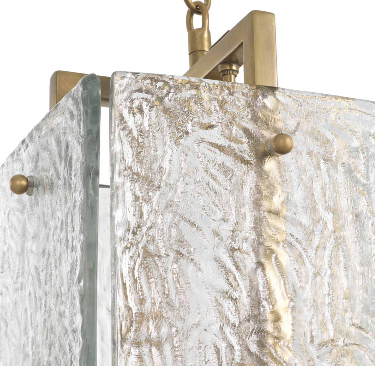 - Lampa wisząca Solara marki Eichholtz łączy wykończenie vintage brass z ręcznie wykonanymi szklanymi panelami. Subtelne różnice w strukturze szkła nadają jej unikalny charakter i eleganckie, nastrojowe światło.