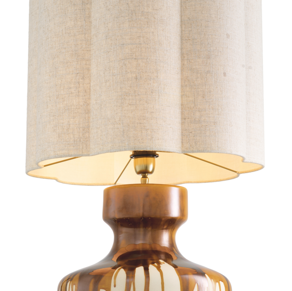 - Lampa stołowa Lorena marki Eichholtz to ceramiczna forma z efektownym brązowym wykończeniem typu drip-effect. Abażur z mieszanki lnu oraz detale w wykończeniu vintage brass nadają jej artystyczny i elegancki charakter.