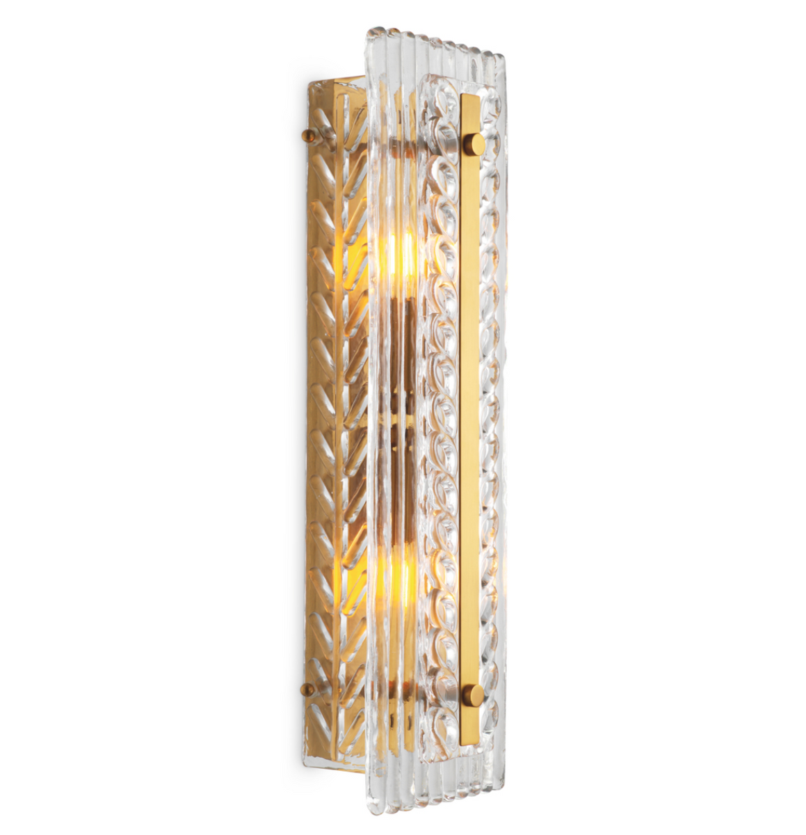 Kinkiet Luciene marki Eichholtz to połączenie klasycznego wykończenia w kolorze antycznego mosiądzu i ręcznie formowanego szkła o misternych zdobieniach. Warstwowa struktura szkła delikatnie rozprasza światło, wprowadzając luksusowy, nastrojowy klimat do eleganckich aranżacji. Wymiary: szer. 15 | głęb. 10 | wys. 50 cm