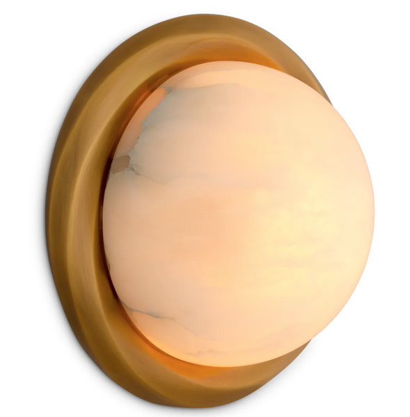Kinkiet Vigo marki Eichholtz łączy naturalny alabaster z wykończeniem w kolorze antycznego mosiądzu. Okrągła forma i subtelne, rozproszone światło tworzą przytulną atmosferę, a szlachetne materiały podkreślają luksusowy, klasyczny styl lampy. Idealny wybór do eleganckich aranżacji wnętrz. Wymiary: Ø 22,5 | głęb. 11 | wys. 22,5 cm