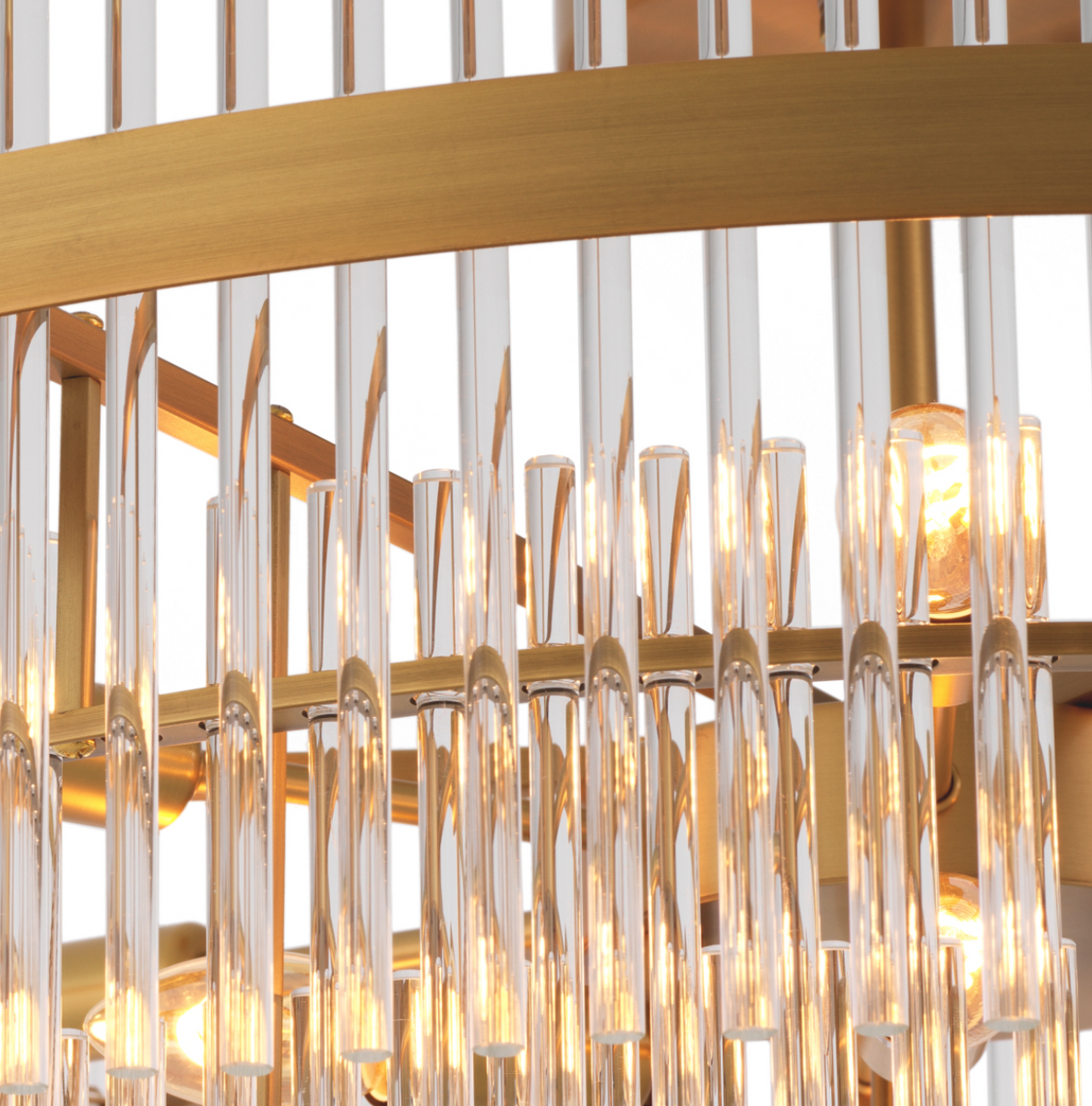 Żyrandol East marki Eichholtz to wyrafinowane oświetlenie inspirowane estetyką lat 20. Antyczny mosiądz w połączeniu z klarownym szkłem nadaje jej ponadczasowy charakter i elegancję. Doskonale sprawdzi się jako dekoracyjny i funkcjonalny element reprezentacyjnych wnętrz. Wymiary: Ø 81 | wys. 38 cm
