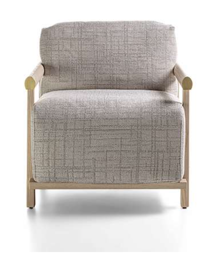 Konstrukcja: lite drewno (jesion) oraz płyta ze sklejki tapicerowana tkaniną. Siedzisko: wypełnienie z wysoko elastycznej pianki poliuretanowej o zróżnicowanej gęstości, otulina z włókien poliestrowych i bawełnianych, pokrowiec zdejmowany. Oparcie i boki: puch gęsi najwyższej jakości z wkładem z wysoko elastycznej pianki poliuretanowej oraz otuliną z włókien poliestrowych i bawełnianych, pokrowiec zdejmowany. Elementy metalowe: satynowany mosiądz lub metal w kolorze brązu. Wymiary: 70 x 88 x h.73 cm