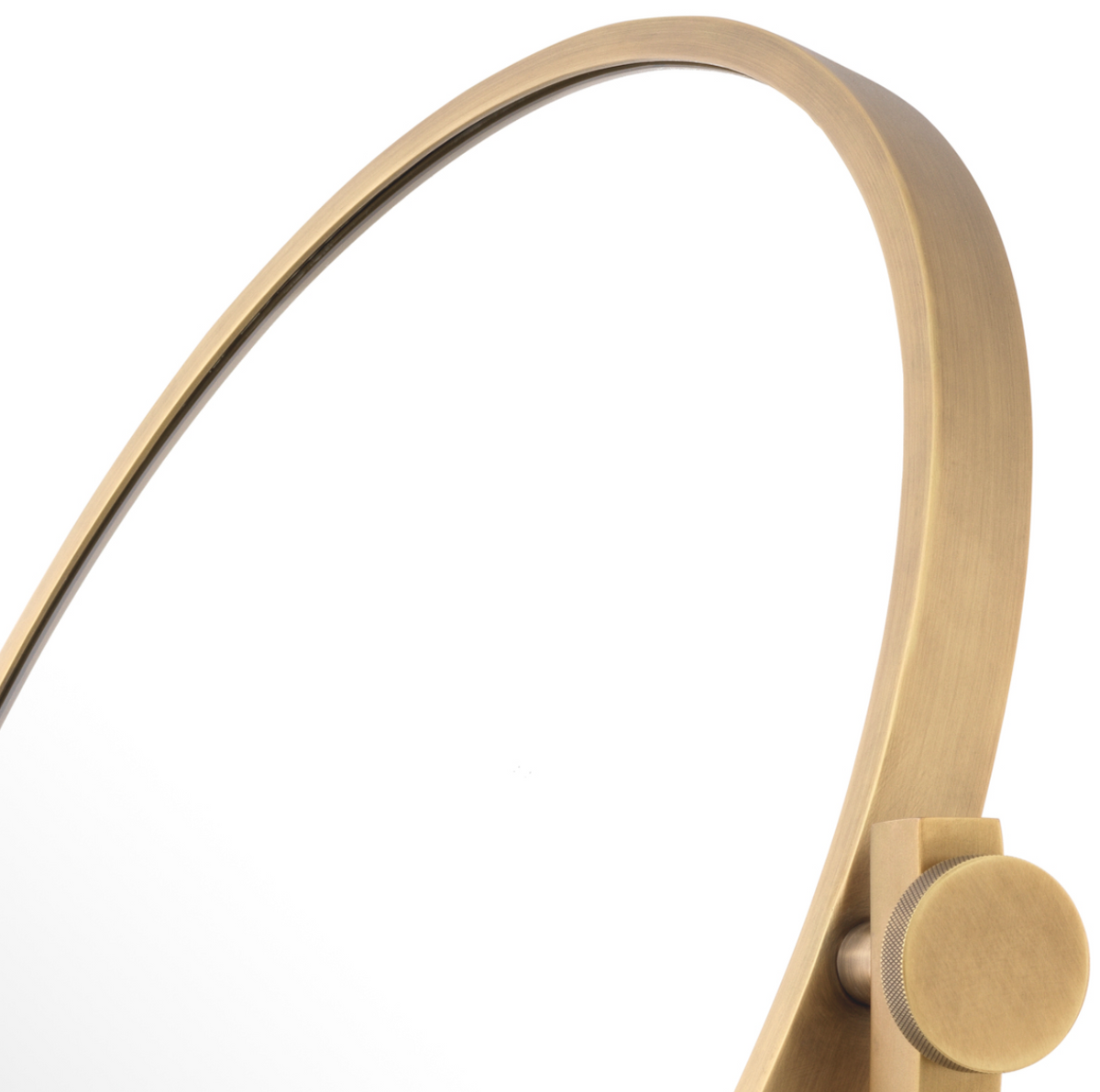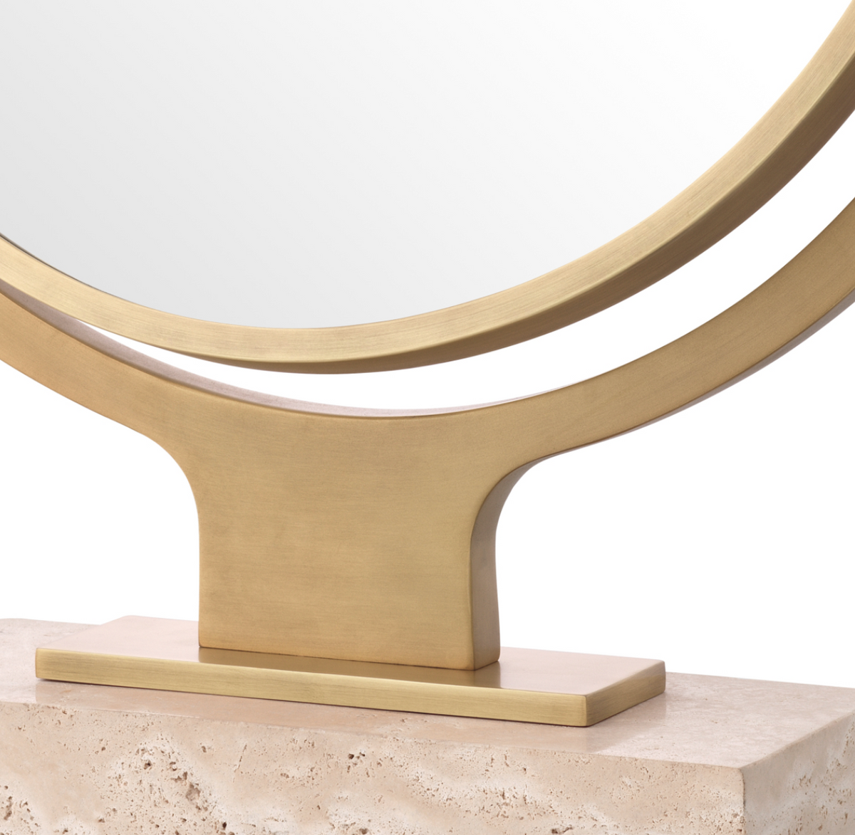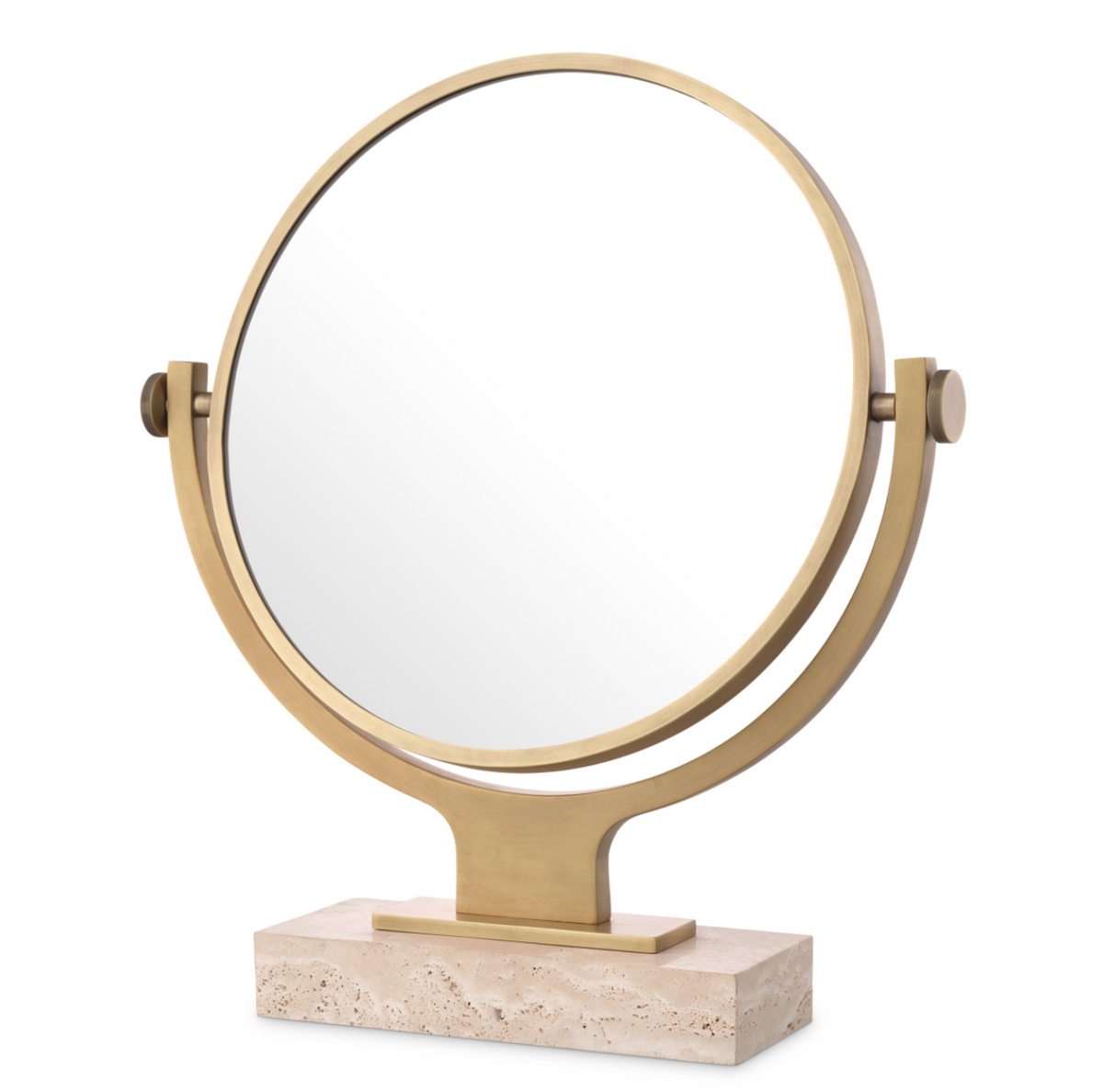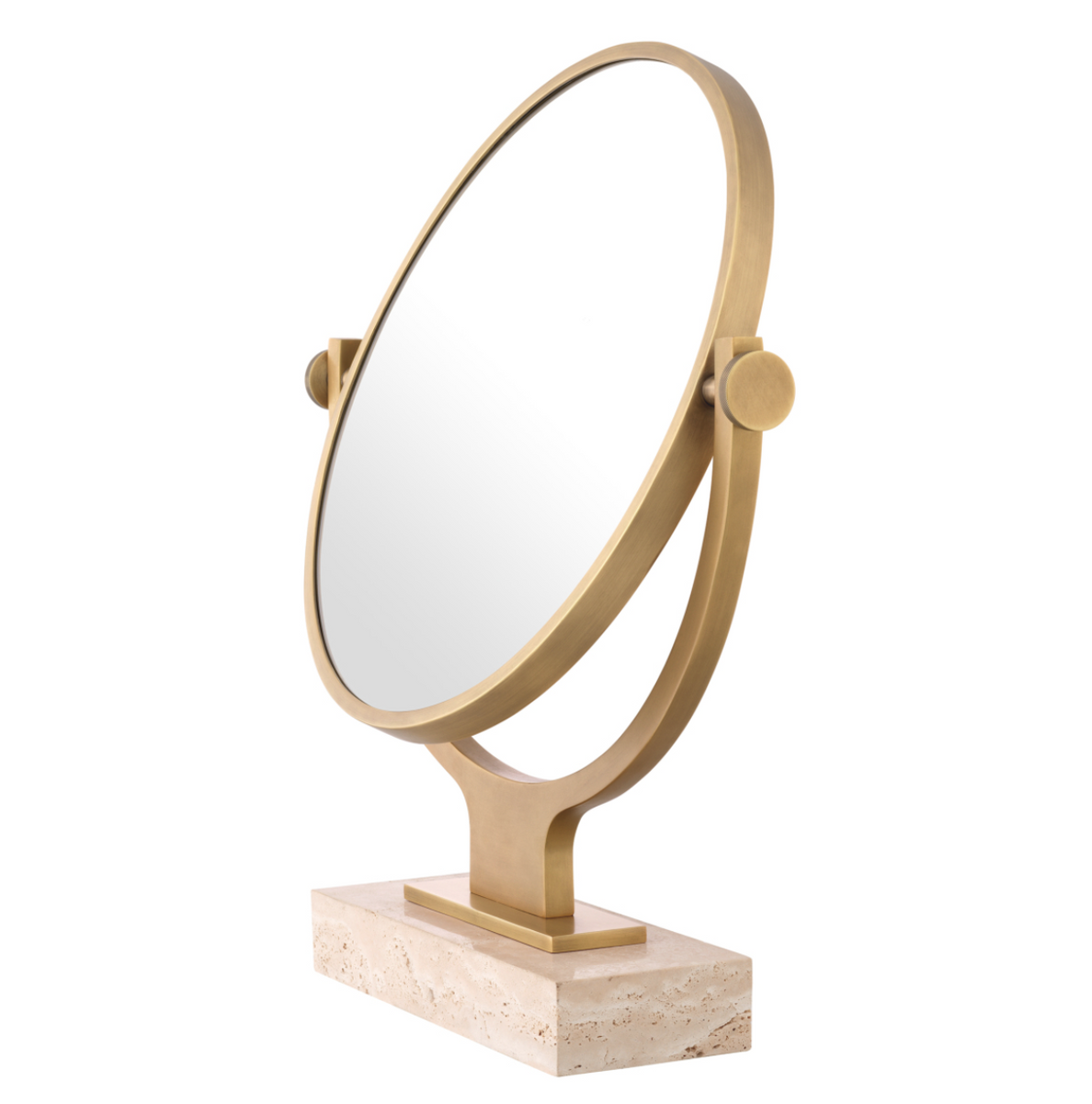 - Lustro Briancon marki Eichholtz to eleganckie, obrotowe lustro stołowe z wykończeniem antique brass. Osadzone na solidnej podstawie z trawertynu, idealne do makijażu lub golenia.