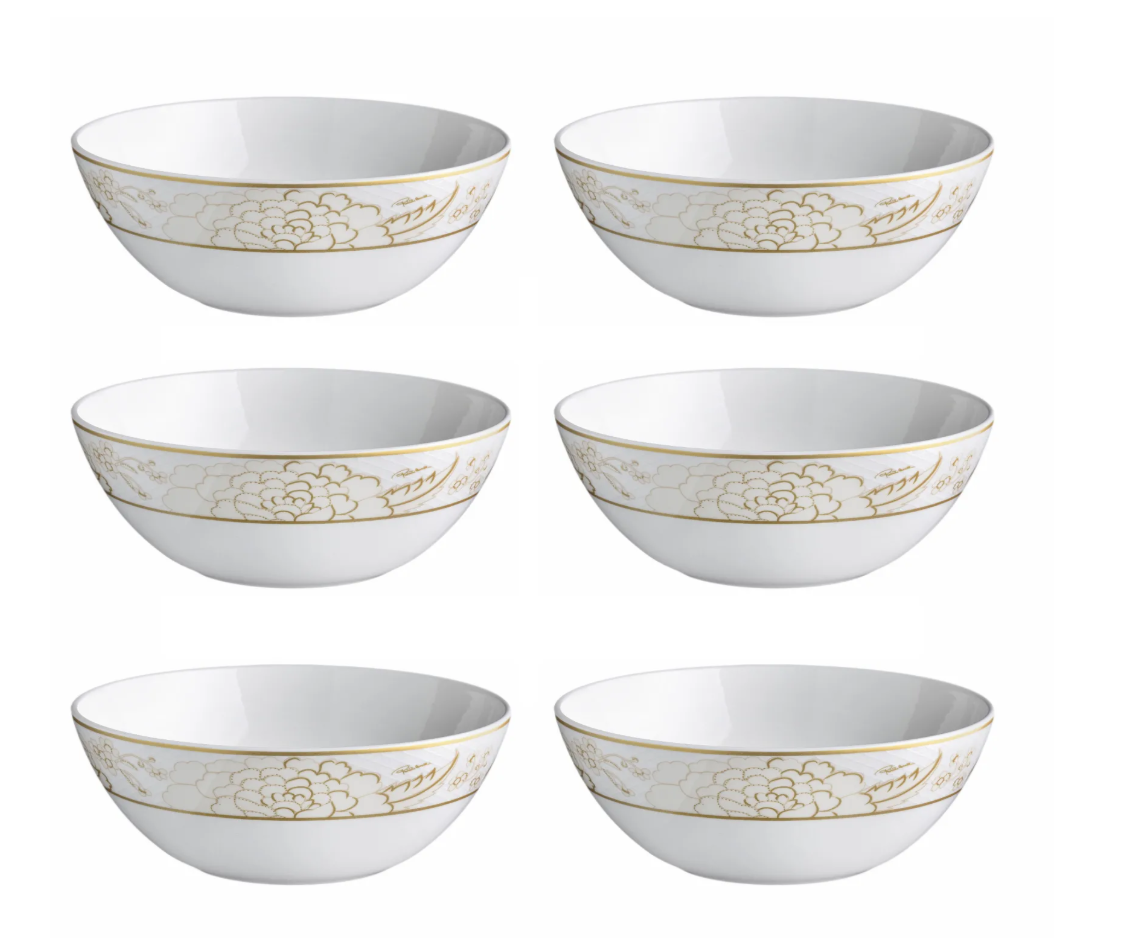 Zestaw sześciu misek do zupy marki Roberto Cavalli Home z kolekcji Blooming Roses. Wykonane z wysokiej jakości porcelany miski należą do kolekcji inspirowanej wiosną, czego wyrazem jest subtelna, kwiatowa dekoracja utrzymana w eleganckich odcieniach beżu i złota. Delikatne zdobienia nadają całości lekkości i wyrafinowanego charakteru, podkreślając luksusowy styl marki Roberto Cavalli Home. Kolekcja Blooming Roses tworzy elegancką i harmonijną zastawę stołową, która z pewnością zachwyci gości. Wymiary: Ø 14,5 × wys. 6 cm.