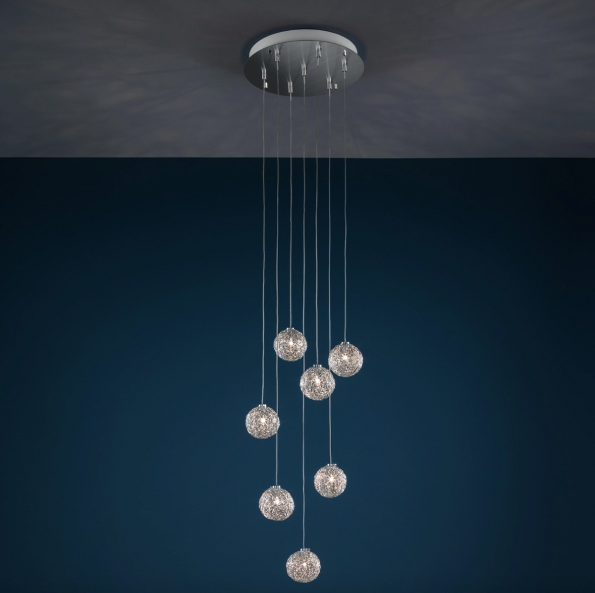 Model CSL7CL składa się z 7 kul Sweet Light wykonanych z naturalnego aluminium, zawieszonych pod okrągłą, satynowaną stalową podstawą. Regulowana wysokość do 180 cm pozwala dopasować kompozycję do charakteru wnętrza, czyniąc lampę idealnym wyborem do salonów, jadalni oraz eleganckich przestrzeni komercyjnych. Lampa dostępna jest również w innych konfiguracjach liczby elementów oraz wymiarów.