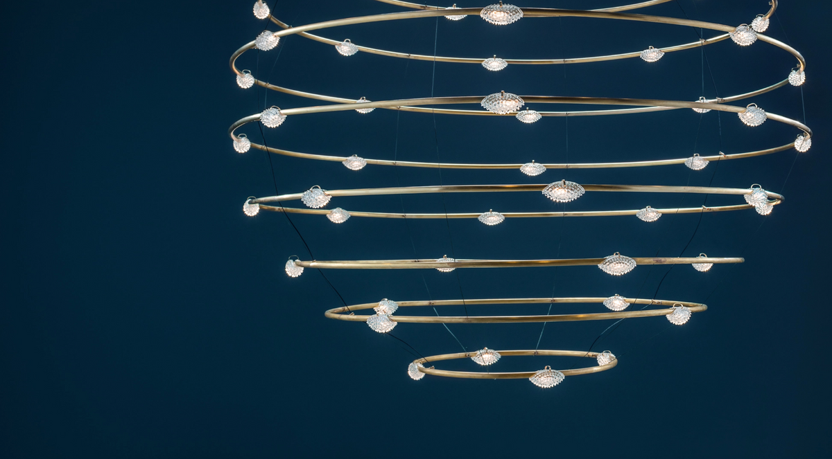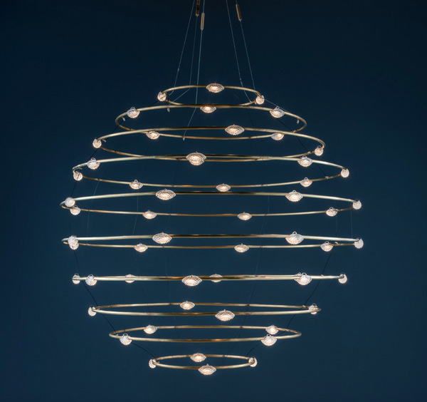 Kompozycję tworzą koncentryczne pierścienie z nieobrobionego mosiądzu, uzupełnione transparentnymi osłonami mocowanymi mosiężnymi klipsami. Wewnątrz rozmieszczono 56 punktów świetlnych LED, emitujących ciepłe światło o barwie 2700 K, które równomiernie rozprasza się w przestrzeni. Regulowana długość zawieszenia pozwala dopasować lampę do wnętrz o dużej kubaturze, czyniąc ją efektownym centrum aranżacji. Lampa dostępna jest również w innych wariantach.