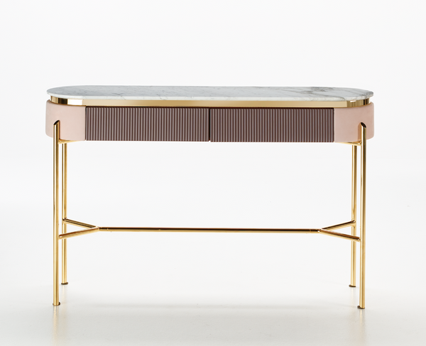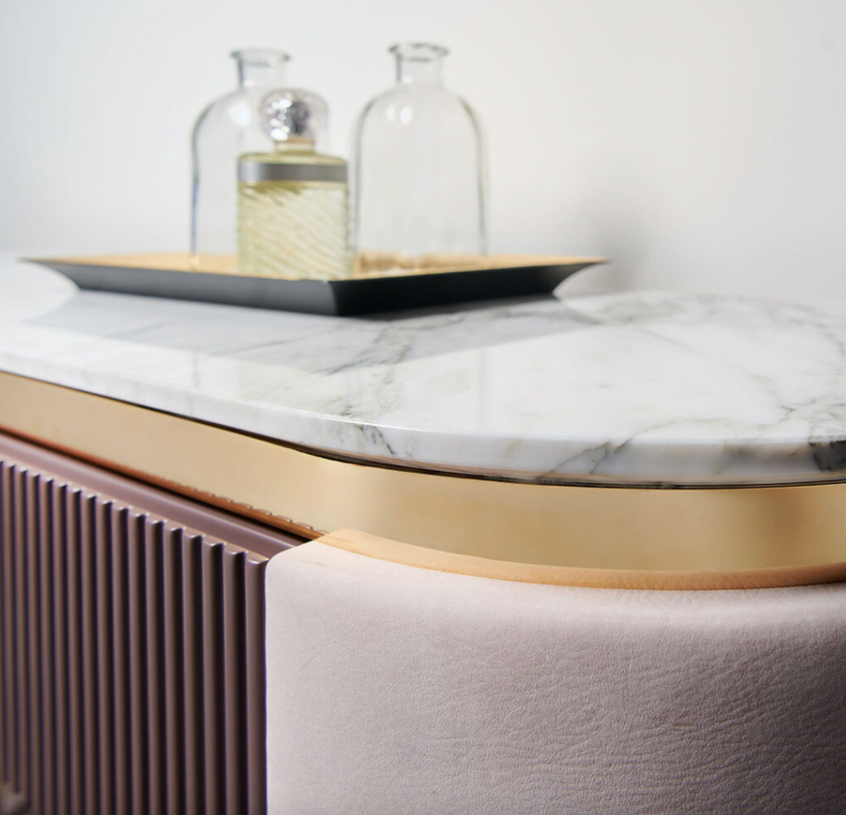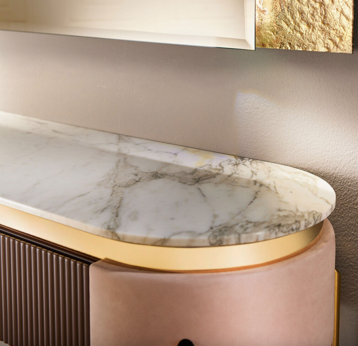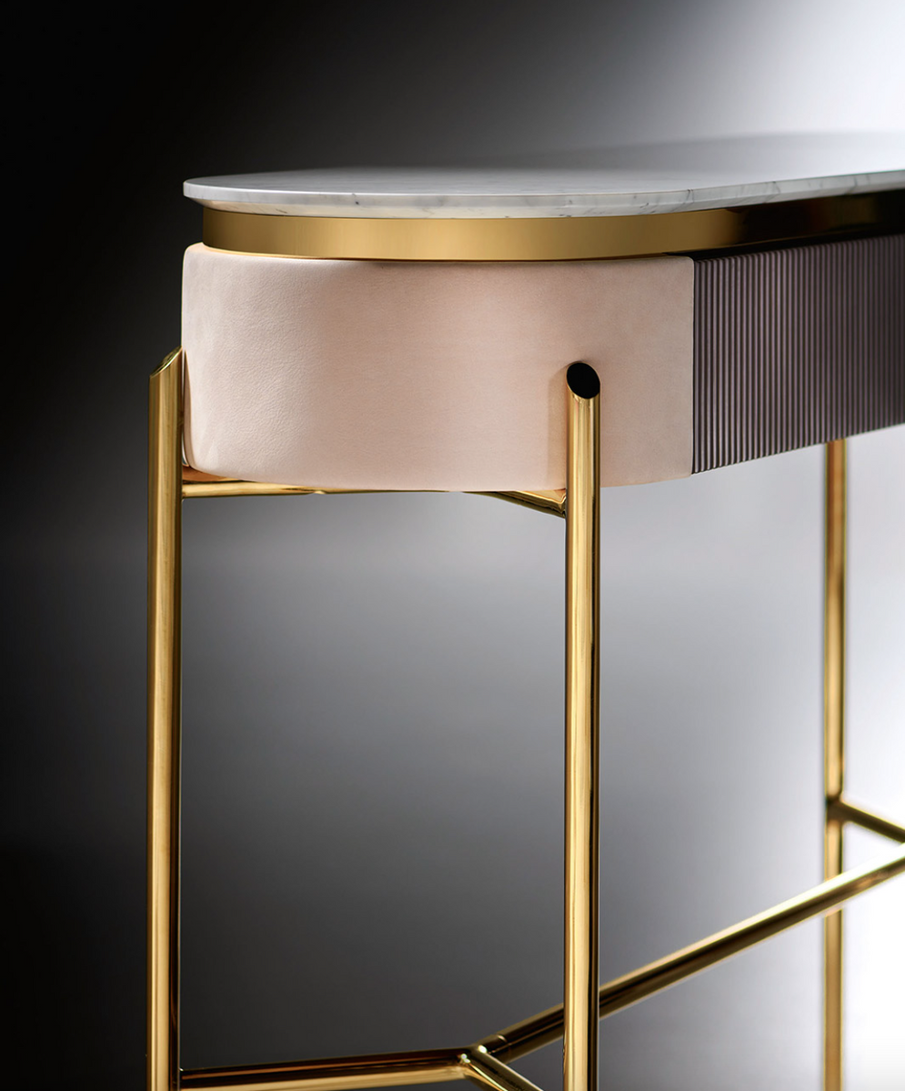 Zaokrąglone boki łagodzą bryłę konsoli, podkreślając jej nowoczesny i dekoracyjny charakter. Frontowe szuflady wykonane z drewna wyróżniają się reliefową obróbką w postaci pionowych kanalików oraz prowadnicami z cichym domykiem, zapewniając wysoki komfort użytkowania. Boki konsoli mogą być wykończone tkaniną lub skórą, wybraną z bogatej palety dostępnych materiałów. Blat z marmuru Carrara nadaje całości elegancji i prestiżu; na życzenie dostępna jest również wersja z blatem drewnianym lub szklanym.