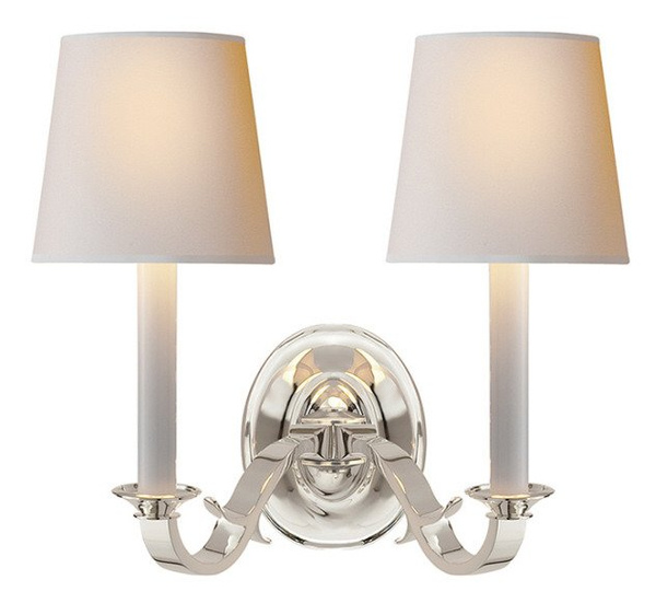 - Kinkiet Channing Double firmy Thomas O'Brien został wykonany z polerowanego srebra oraz wykończony dwoma, papierowymi abażurami w kolorze bieli.