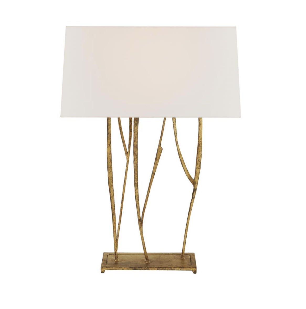 Lampa stołowa Aspen projektu Ian K. Fowler z ręcznie kutego żelaza w kolorze postarzanego złota z lnianym abażurem, przywołuje estetykę gałęzi drzew. Lampa posiada gniazdo na żarówkę E 27. Wymiary: 57,2 x 40,7 x 11,5 cm.