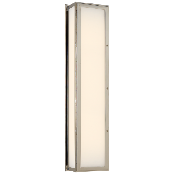 - Kinkiet Mercer Long Box firmy Thomas O'Brien został wykonany z niklu polerowanego na wysoki połysk oraz białego szkła.