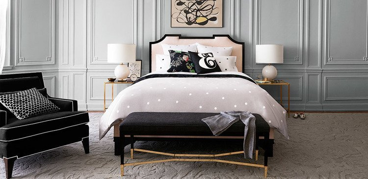 - Lampa stołowa Elsie firmy Kate Spade New York została wykonana ze szkła oraz wykończona lnianym abażurem.