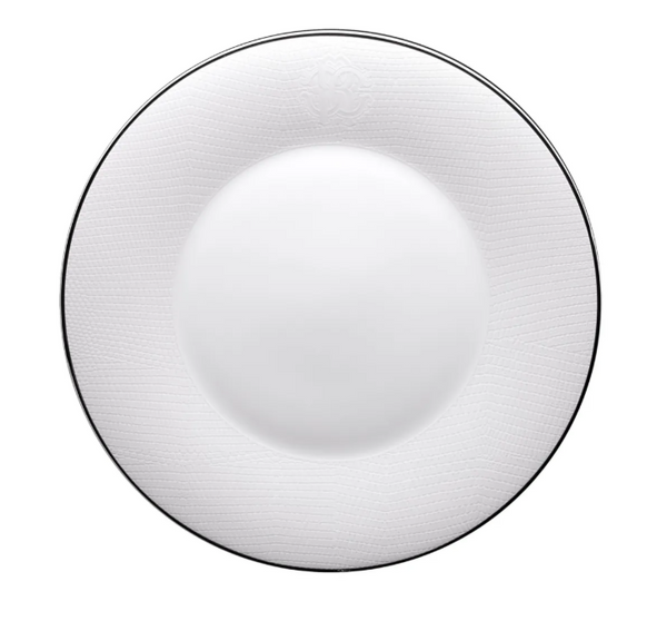 - Talerz obiadowy marki Roberto Cavalli Home z kolekcji Lizzard Platin. Wykonany z wysokiej jakości porcelany, zdobiony subtelnym wzorem inspirowanym strukturą skóry gadów w tonacji ton-w-ton oraz eleganckim srebrnym rantem. Średnica 27,5 cm.