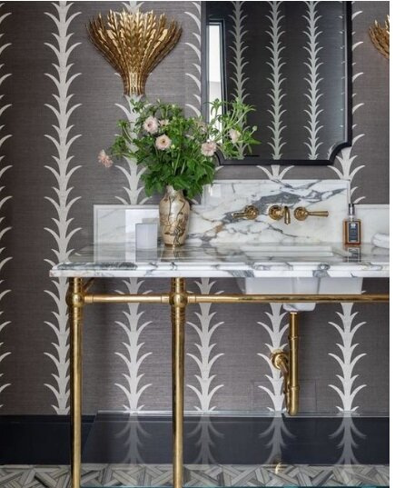 Kinkiet Hampton firmy Aerin został pokryta złotem. Lampa posiada gniazdo na żarówkę E 27. Wymiary: 30,5 x 38,1 x 17,8 cm.