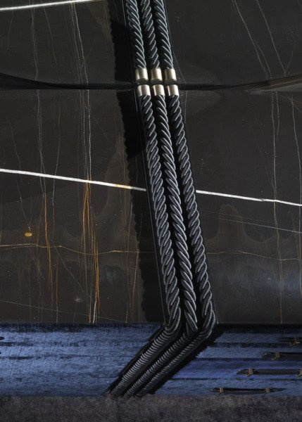 - Komoda Moore marki Gianfranco Ferré Home posiada konstrukcję z drewna bukowego z wykończeniem w kolorze czarnym lakierowanym, pokryta tkaniną lub skórą z kolekcji, blat z marmuru kat. A, dekoracyjne liny i skórzane uchwyty.
