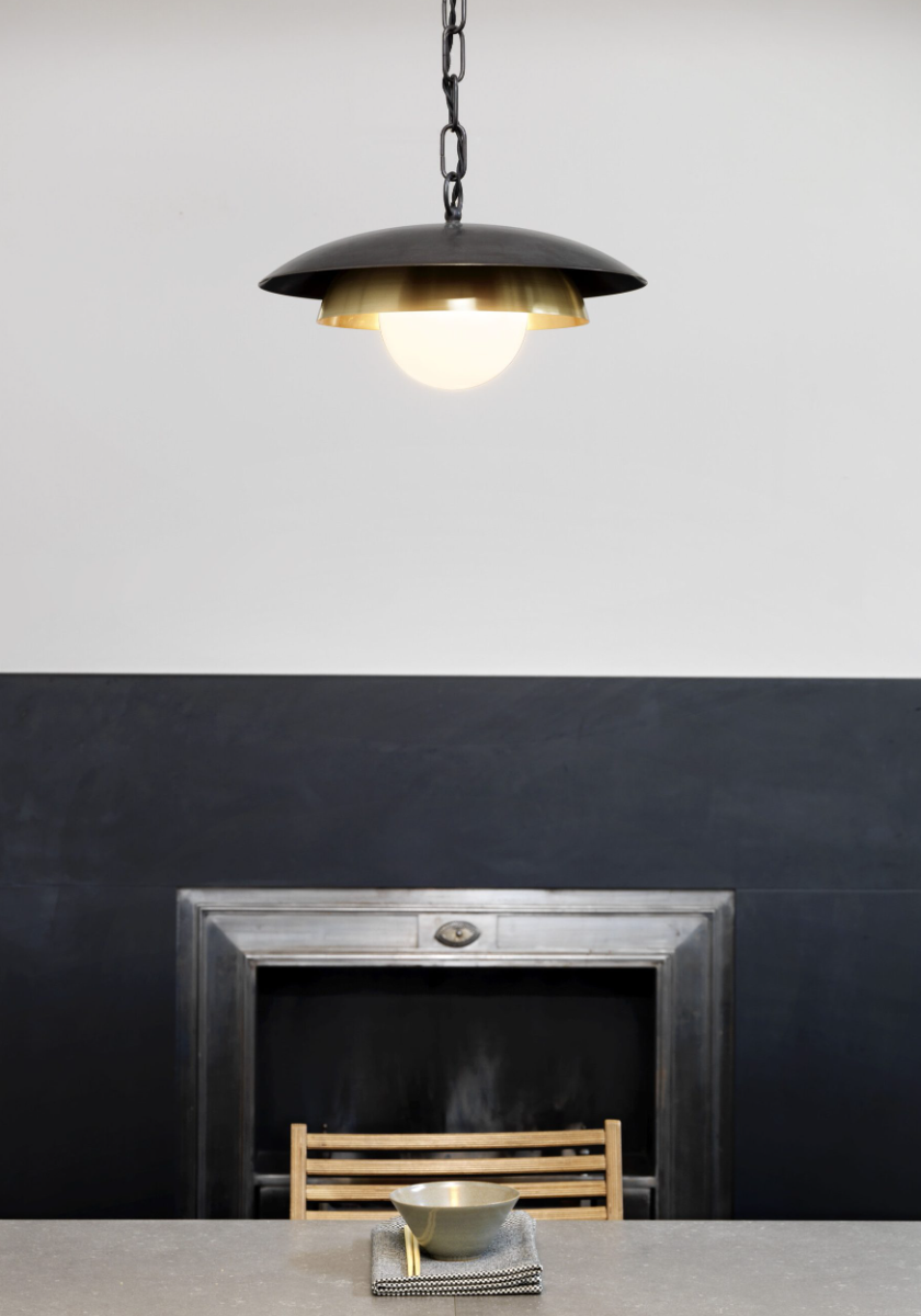 Lampa wisząca Carapace marki CTO Lighting, posiada ręcznie przędzone metalowe klosze wykończone brązem i mosiądzem. Otwory w przędzeniu pozwalają światłu świecić wewnątrz, a szkło opalowe równomiernie rozprasza światło.