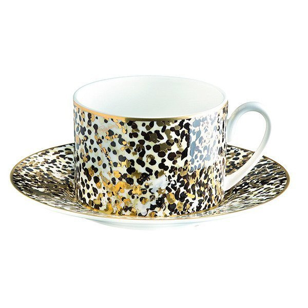 - Zestaw dwóch filiżanek do herbaty firmy Roberto Cavalli Home, z kolekcji Camouflage został wykonany, z białej, wysokiej jakości porcelany Bone China. Filiżanka została pokryta 24 karatowym złotem.