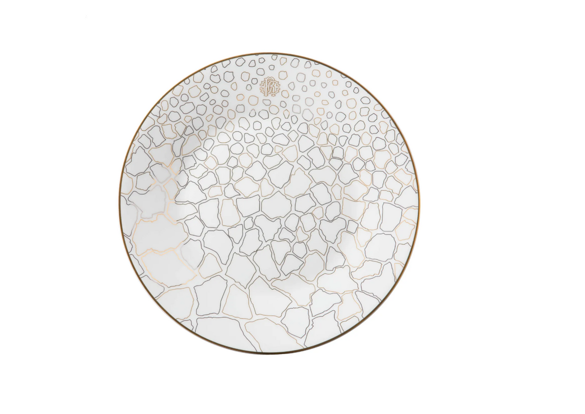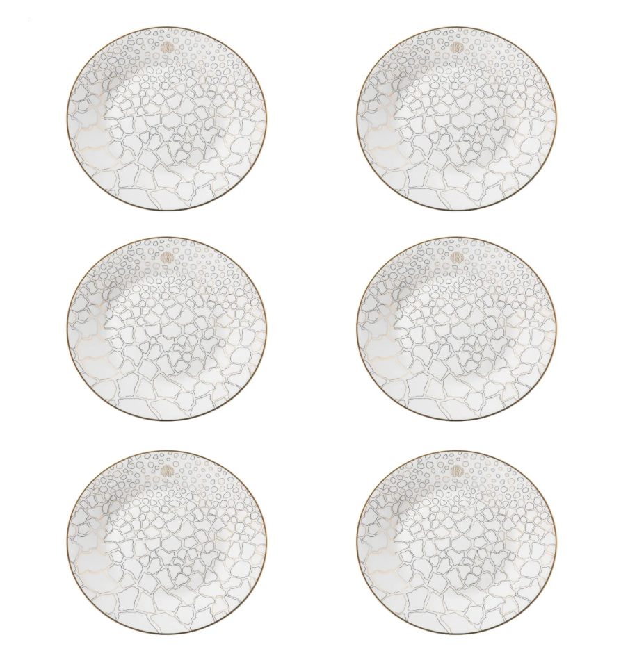 - Zestaw talerzy do chleba i masła został wykonany z wysokiej jakości porcelany kostnej. Odznacza się wewnętrzną powłoką, pokrytą złotem i platyną, przypominającą skórę żyrafy oraz monogramem wytłoczonym wewnątrz Roberto Cavalli.