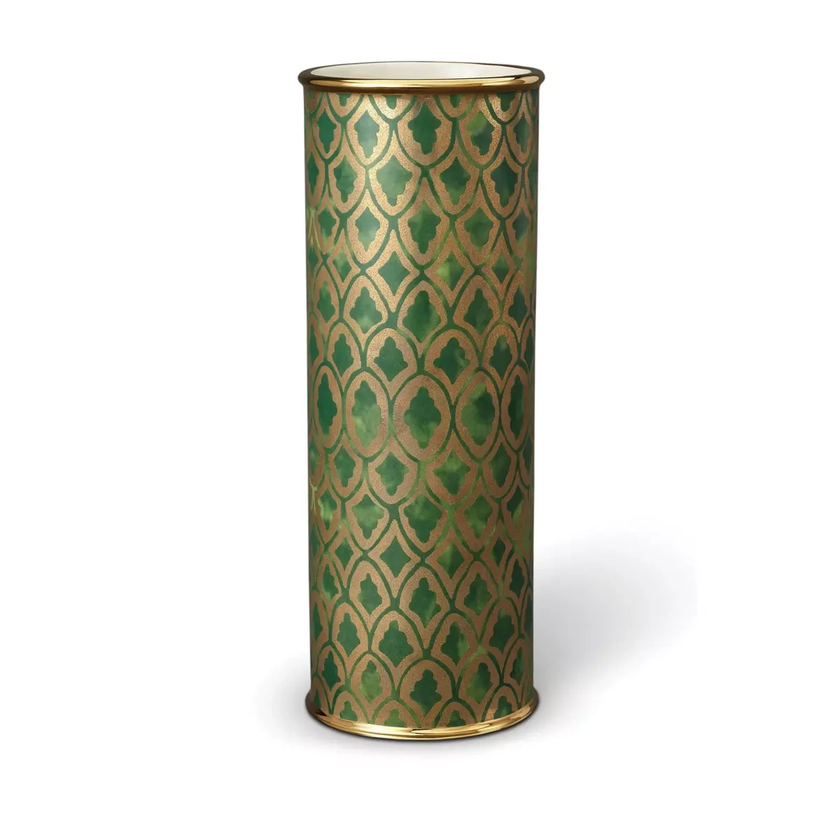 Wazon Fortuny Peruviano Large marki L'Objet to wyjątkowy element dekoracyjny inspirowany bogatą estetyką domu Fortuny. Smukła forma została ozdobiona powtarzalnym ornamentem w odcieniach zieleni i złota, który nadaje całości elegancki, artystyczny wyraz. Złote wykończenie krawędzi podkreśla luksusowy charakter wazonu, czyniąc go efektownym akcentem zarówno klasycznych, jak i nowoczesnych aranżacji wnętrz. Wymiary: 11 x 30 cm.