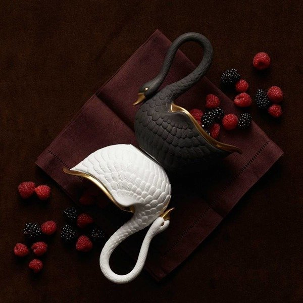 - Miseczka na przyprawy w kształcie łabędzia firmy L'Objet, z kolekcji Swan została wykonana z porcelany oraz wykończona 24 karatowym złotem.