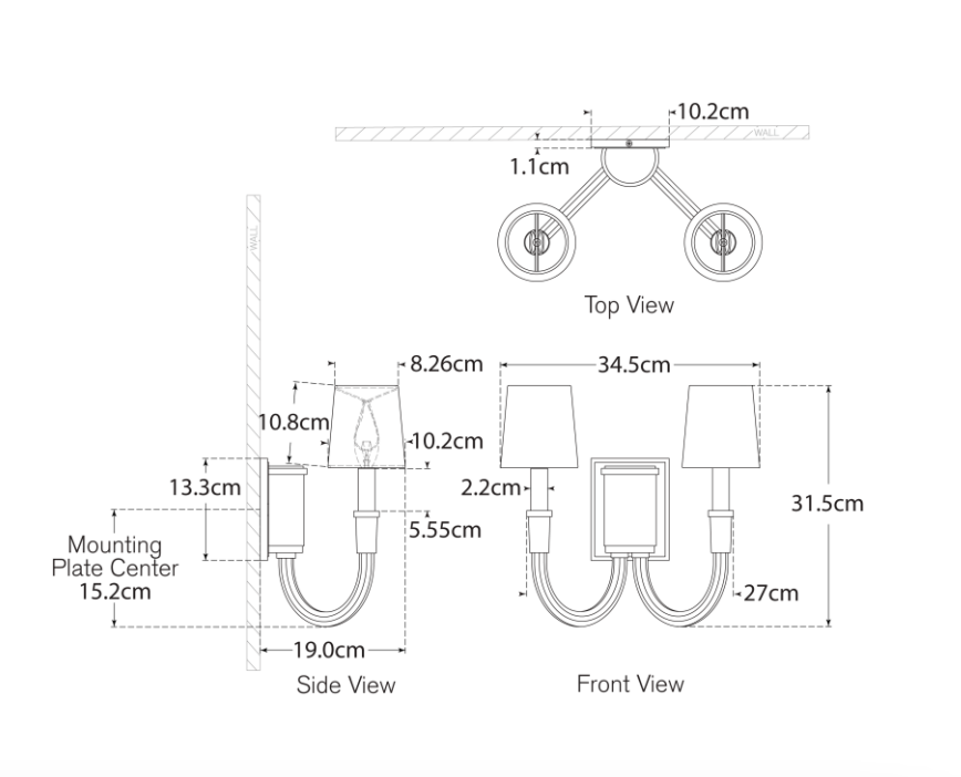 Kinkiet Vivian Double projektu Thomas O'Brien wykonany ze szczotkowanego antycznego mosiądzu i kryształu, wykończony lnianymi abażurami. Wymiary: 34,3 x 34,3 x 21,6 cm.
