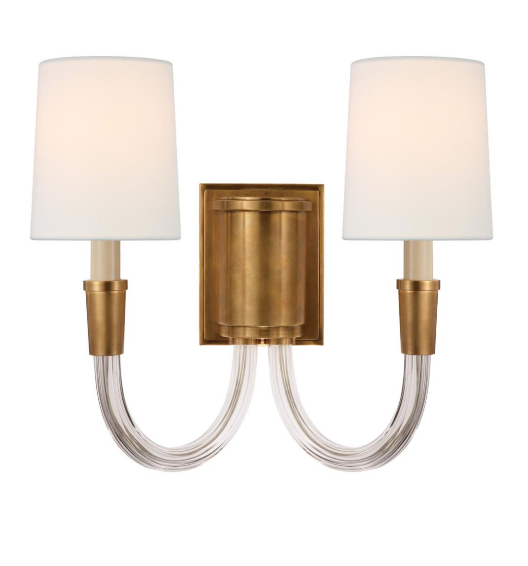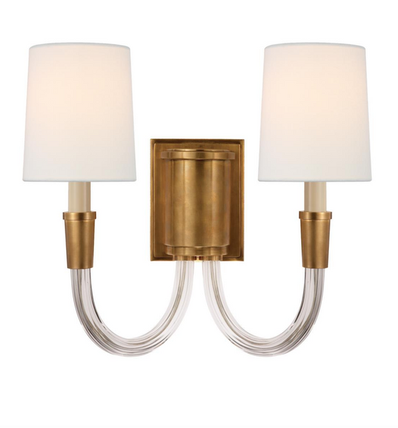 • Kinkiet Vivian Double projektu Thomas O'Brien wykonany ze szczotkowanego antycznego mosiądzu i kryształu, wykończony lnianymi abażurami.