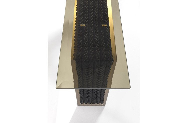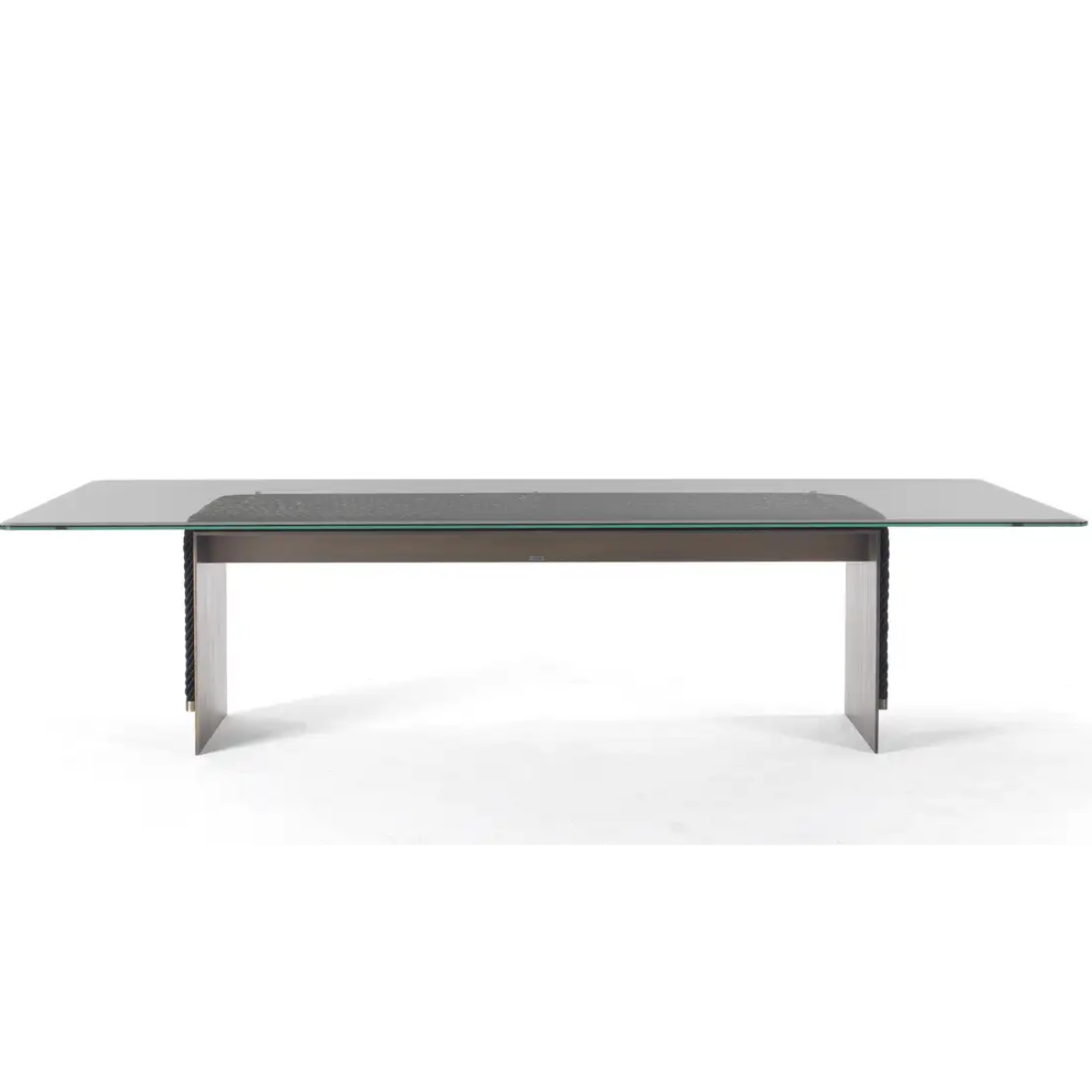 Stół Glasgow marki Gianfranco Ferré Home wykonany z aluminium z wykończeniem w kolorze szczotkowanego brązu. Blat z przezroczystego i przydymionego szkła. Dekoracyjne liny w kolorze czarnym lub szampańskim. Detale w wykończeniu Brushed Bronze. Opcjonalna aluminiowa leniwa zawieszka z wykończeniem ze szczotkowanego brązu tylko w wersji okrągłej. Wymiary: 300 x 125 x 77 cm