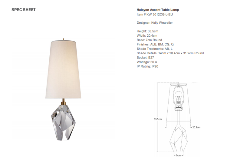 Lampa stołowa Halcyon projektu Kelly Wearstler została wykonana z kryształu oraz wykończona jasnym abażurem. Lampa posiada gniazdo na żarówkę E 27.