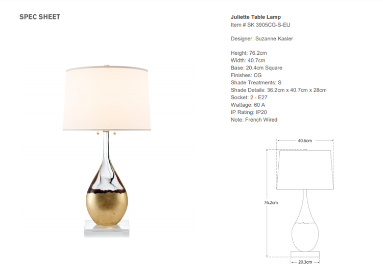 - Lampa stołowa Juliette projektu Suzanne Kasler została wykonana z kryształu oraz wykończona jasnym, jedwabnym abażurem. Lampa posiada gniazdo na żarówkę E 27.