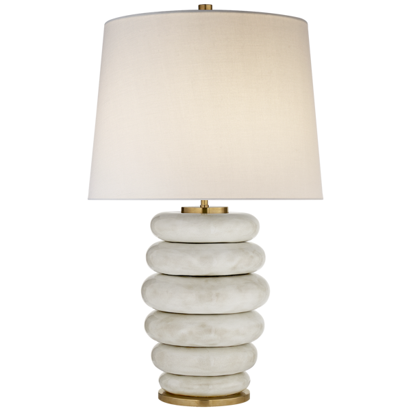 Lampa stołowa Stacked Phoebe projektu Kelly Wearstler marki Visual Comfort z antycznej ceramiki w białym kolorze, wykończona lnianym abażurem. Lampa posiada gniazdo na żarówkę E 27.