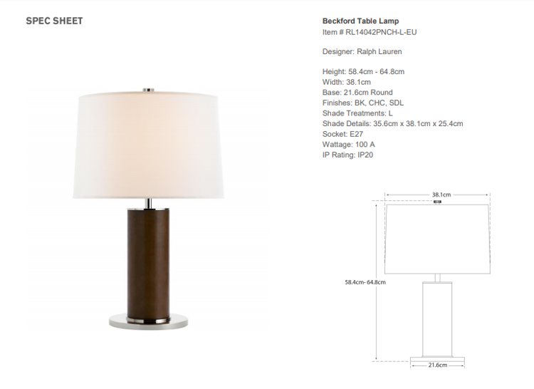- Lampa stołowa Beckford projektu Ralph Lauren Home została wykonana z niklu polerowanego na wysoki połysk, naturalnej skóry w ciemnym brązowym kolorze oraz wykończona jasnym abażurem.