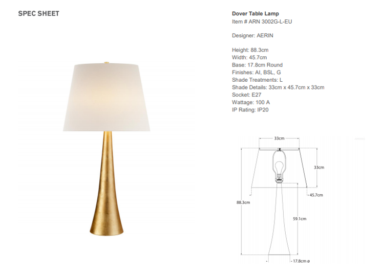 - Lampa stołowa Dover projektu Aerin została pokryta złotem oraz wykończona jasnym, lnianym abażurem. Lampa posiada gniazdo na żarówkę E 27.