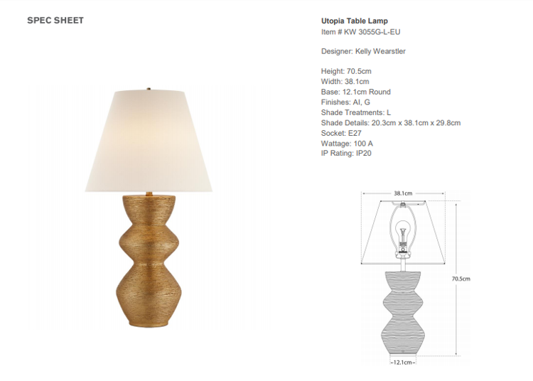 Lampa stołowa Utopia projektu Kelly Wearstler została wykonana w złotym kolorze oraz wykończona jasnym abażurem. Lampa posiada gniazdo na żarówkę E 27.