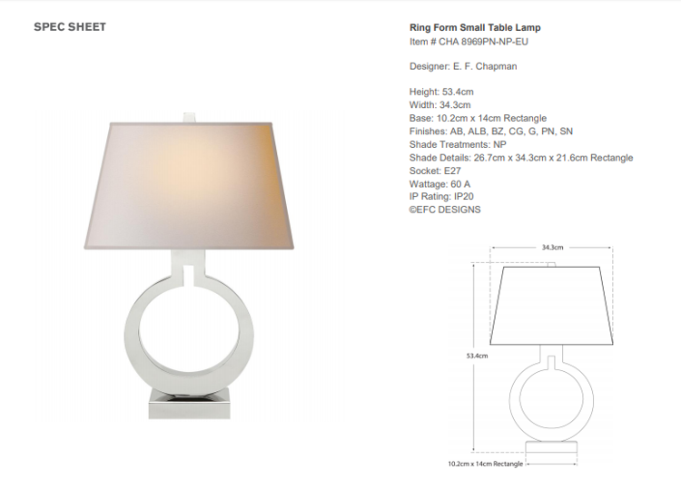 • Lampa stołowa Ring Form Small projektu Chapman & Myers została wykonana z niklu polerowanego na wysoki połysk oraz wykończona jasnym abażurem. Lampa posiada gniazdo na żarówkę E 27.