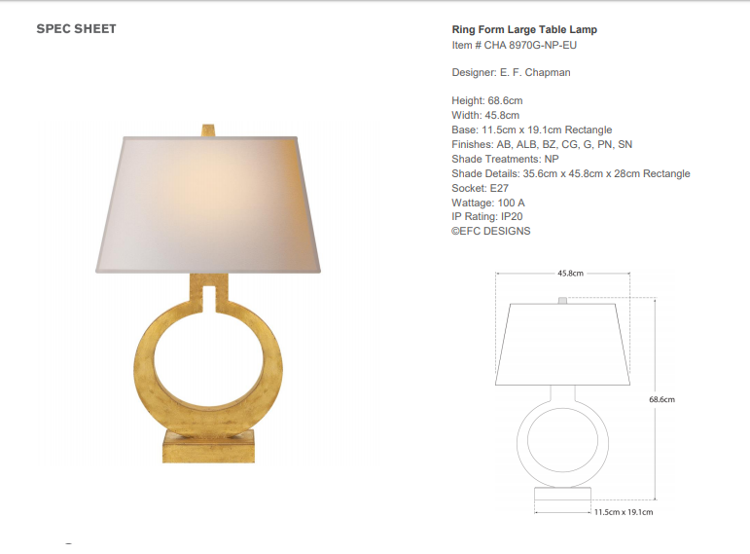 - Lampa stołowa Ring Form Large projektu Chapman & Myers została wykonana w złotym kolorze oraz wykończona jasnym abażurem. Lampa posiada gniazdo na żarówkę E 27.