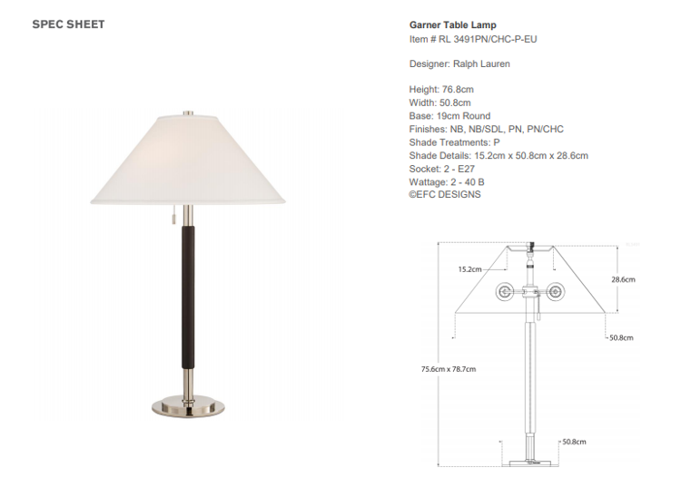 Lampa stołowa Garner projektu Ralph Lauren Home została wykonana z niklu polerowanego na wysoki połysk, skóry w ciemnym kolorze oraz wykończona jasnym abażurem. Lampa posiada gniazdo na żarówkę E 27. Wymiary: 75,6-78,7 x 50,8 x 19 cm.